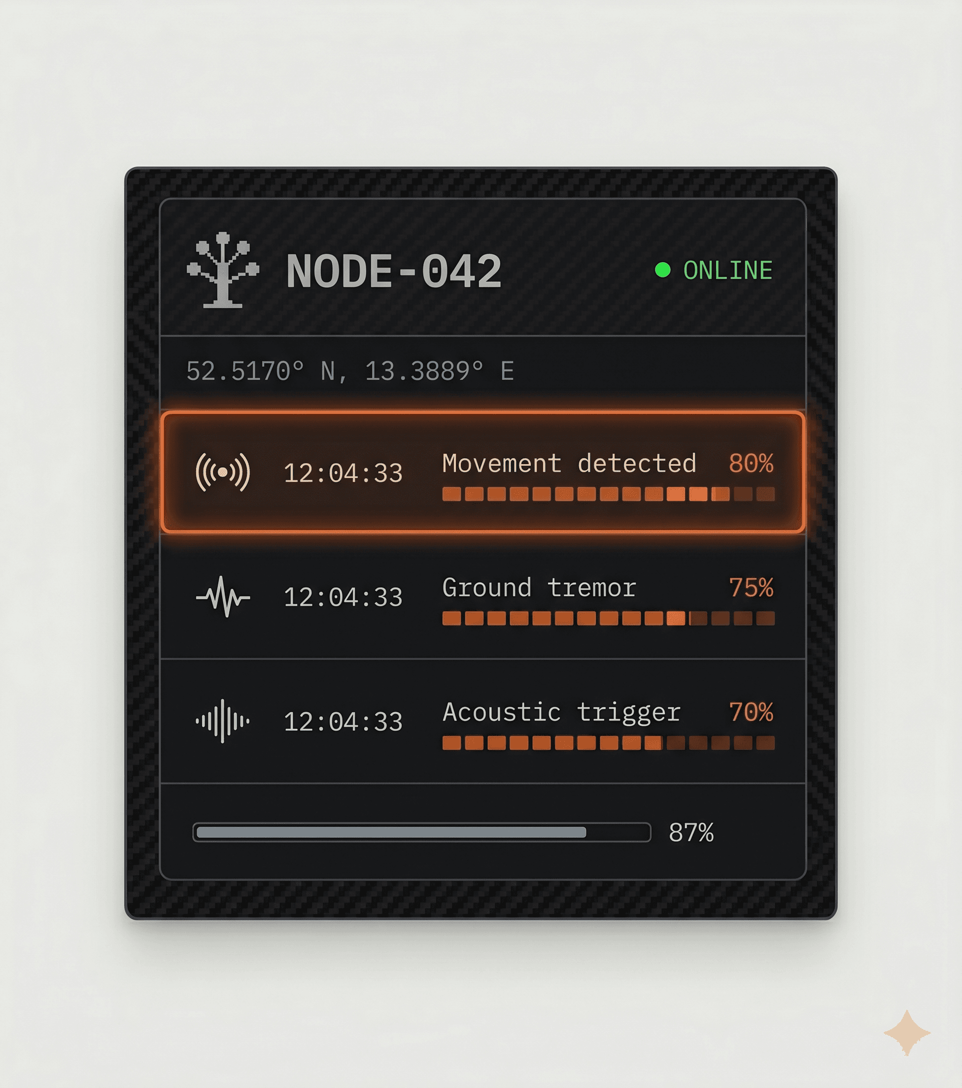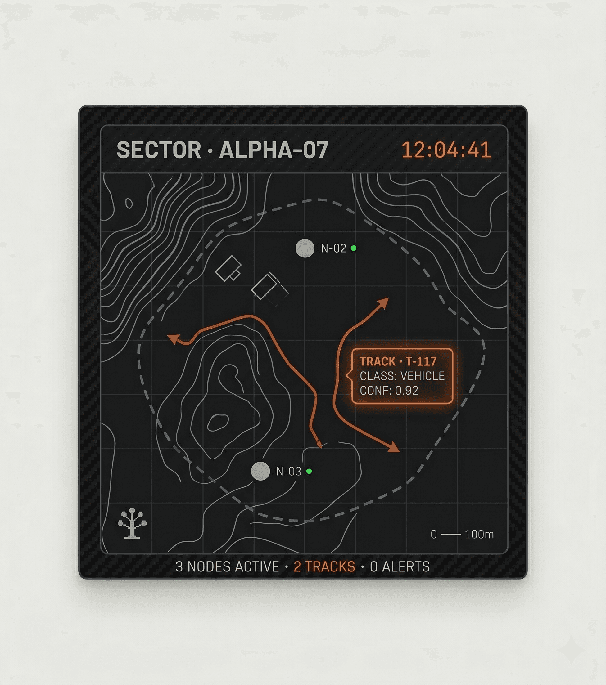 Every node observes locally — motion, vibration, acoustics, RF. Raw signals stay on the device. Only compact, confidence-scored events leave the sensor.