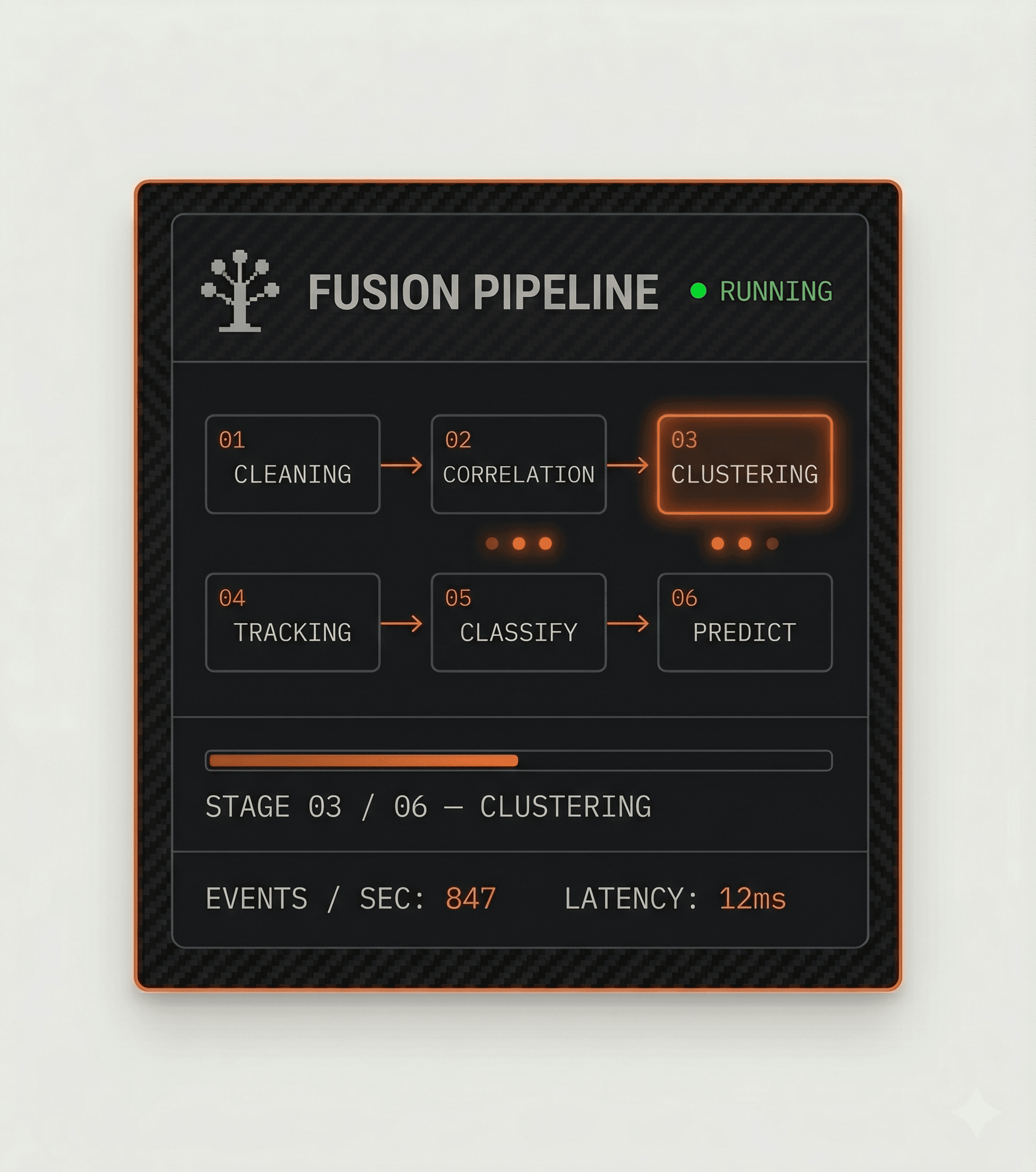 Events from across the mesh are cleaned, correlated, clustered and tracked. The core turns noise into objects, and objects into trajectories.